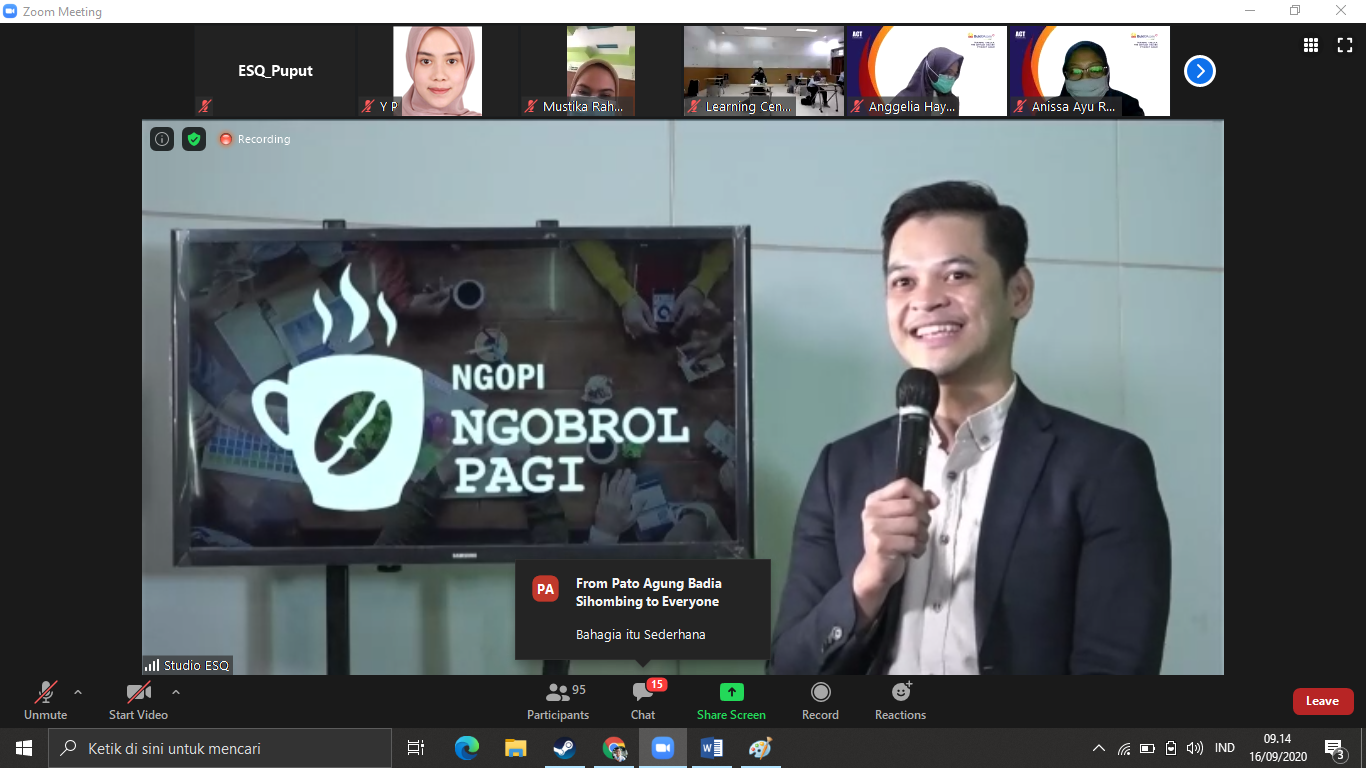 ESQNews.id meninjau dari laman zoom meeting saat acara berlangsung, beberapa peserta lainnya turut serta aktif menjawab dan berbagi rasa bahagianya. Lalu, apa makna yang trainer Rudi tanyakan itu?