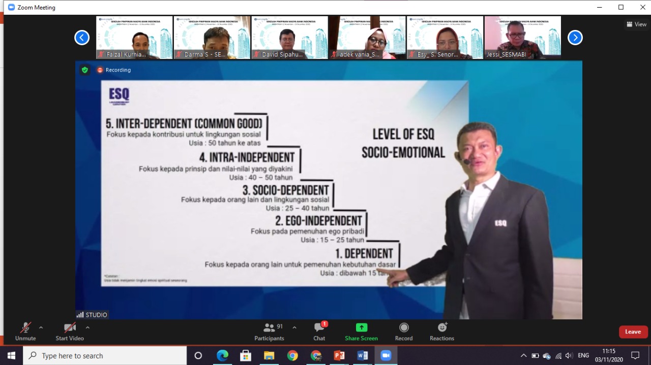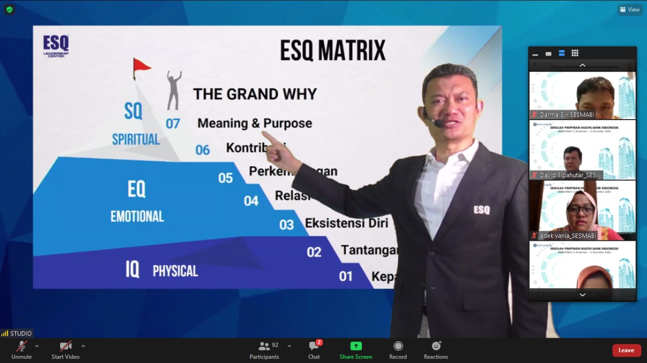 Tampak dari potret saat kegiatan, Coach Iman memaparkan ilmu yang bernama ESQ Matrix. ESQ Matrix terdiri dari 7 level, dan menurutnya para peserta webinar dari BI harus berada di level 7 yaitu memiliki Grand Why (apapun yang dilakukan semata-mata untuk mengabdi kepada Tuhan Yang Maha Esa).