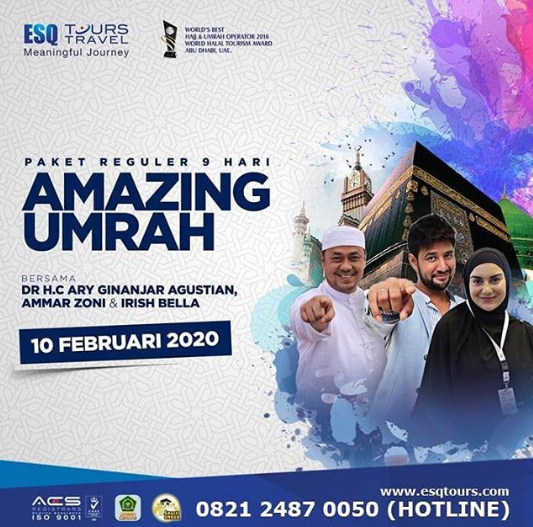 “Bismillah, InsyaAllah saya akan kembali melaksanakan Amazing Umroh bersama @esqtours di bulan Februari (10-18 Februari 2020). Dan lebih spesialnya lagi, @ammarzoni dan @_irishbella_ akan ikut juga, MasyaAllah,” papar Ary Ginanjar dalam IG-nya.