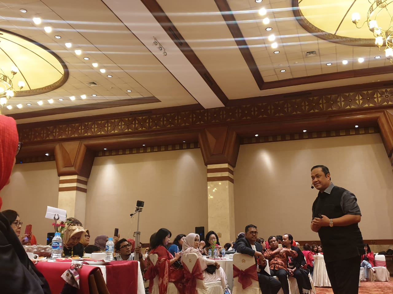 Waktu pemaparan pun tiba. Setelah MC mempersilahkan AGA naik pentas, Pak Ary memasuki hall dan menyalami beberapa pengurus dan peserta di baris terdepan. Saat Bapak sudah di atas panggung, mengucapkan salam dan menyapa peserta, memang suasana halal bihalal sangat terasa, suasana ngobrol dan riuh terdengar dimana mana. AGA meminta asistennya, Ronal Edison memutar lagu dan meminta para peserta berdiri dan bertepuk tangan mengikuti irama lagu. Setelah mulai terbawa lagu dan mulai enjoy, AGA meminta peserta untuk duduk kembali dan fokus menyimak pemaparan.