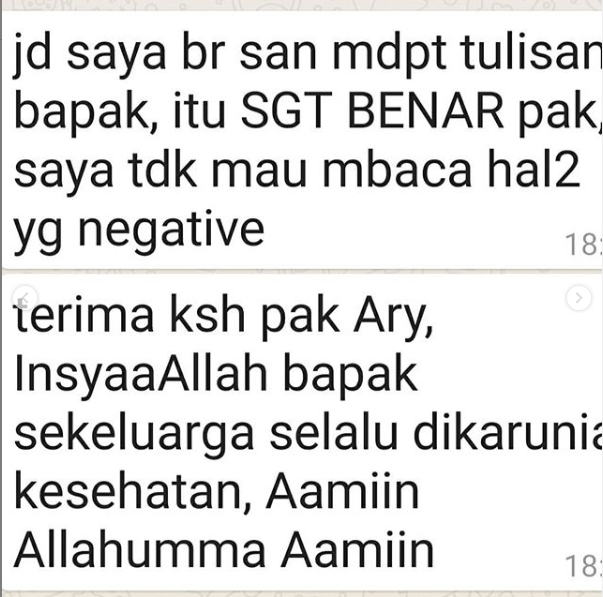“Alhamdulillah Bapak saya sangat setuju dengan tulisan Bapak di atas,” penggalan isi pesannya.