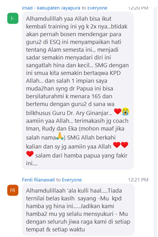 ESQNews.id, JAKARTA – “Alhamdulillah sebagai Mualaf semakin mendekat dengan Allah SWT untuk menggapai Ridho-Nya,” tulis seorang peserta Training ESQ New Chapter bernama Irene Surti Yulianti  dari Bogor di dalam kolom chat Zoom Meeting.