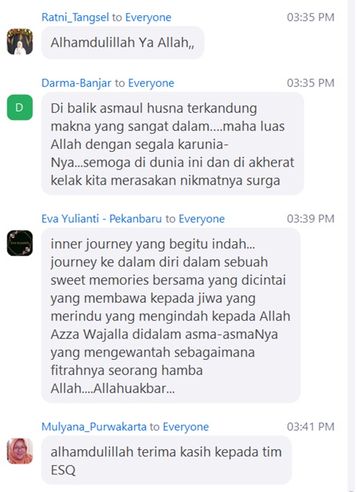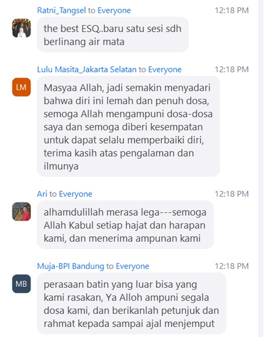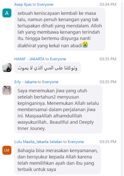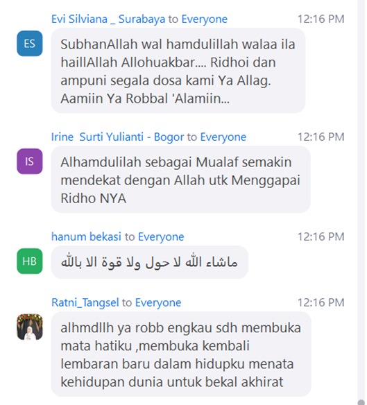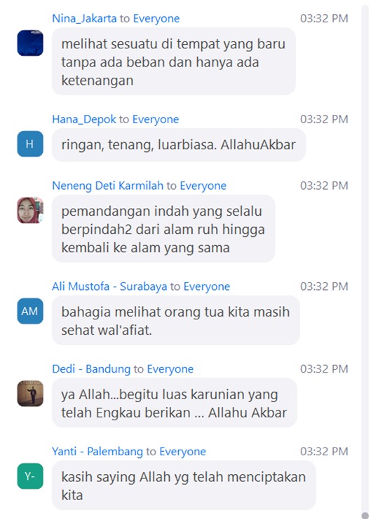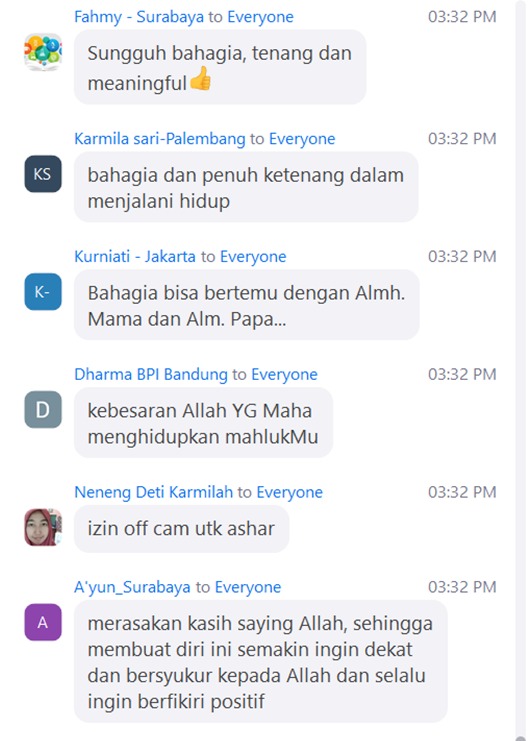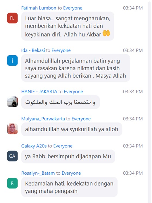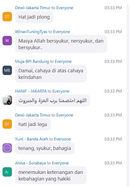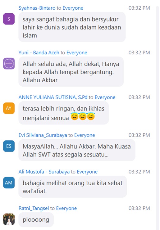 Sehingga adanya reaksi atau respon dari peserta lainnya melalui kolom chat, “MasyaAllah, jadi semakin menyadari bahwa diri ini lemah dan penuh dosa, semoga Allah mengampuni dosa-dosa saya dan semoga diberi kesempatan untuk dapat selalu memperbaiki diri, terimakasih atas pengalaman dan ilmunya.”