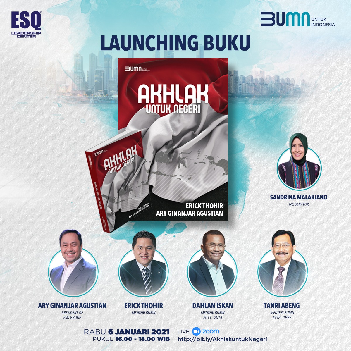 Oleh karena itu, ESQ Leadership Center akan mengadakan acara Peluncuran dan Bedah Buku AKHLAK UNTUK NEGERI, yang akan diselenggarakan pada Rabu (6/1/2021) pukul 16.00 – 18.00 WIB by Zoom Platform.