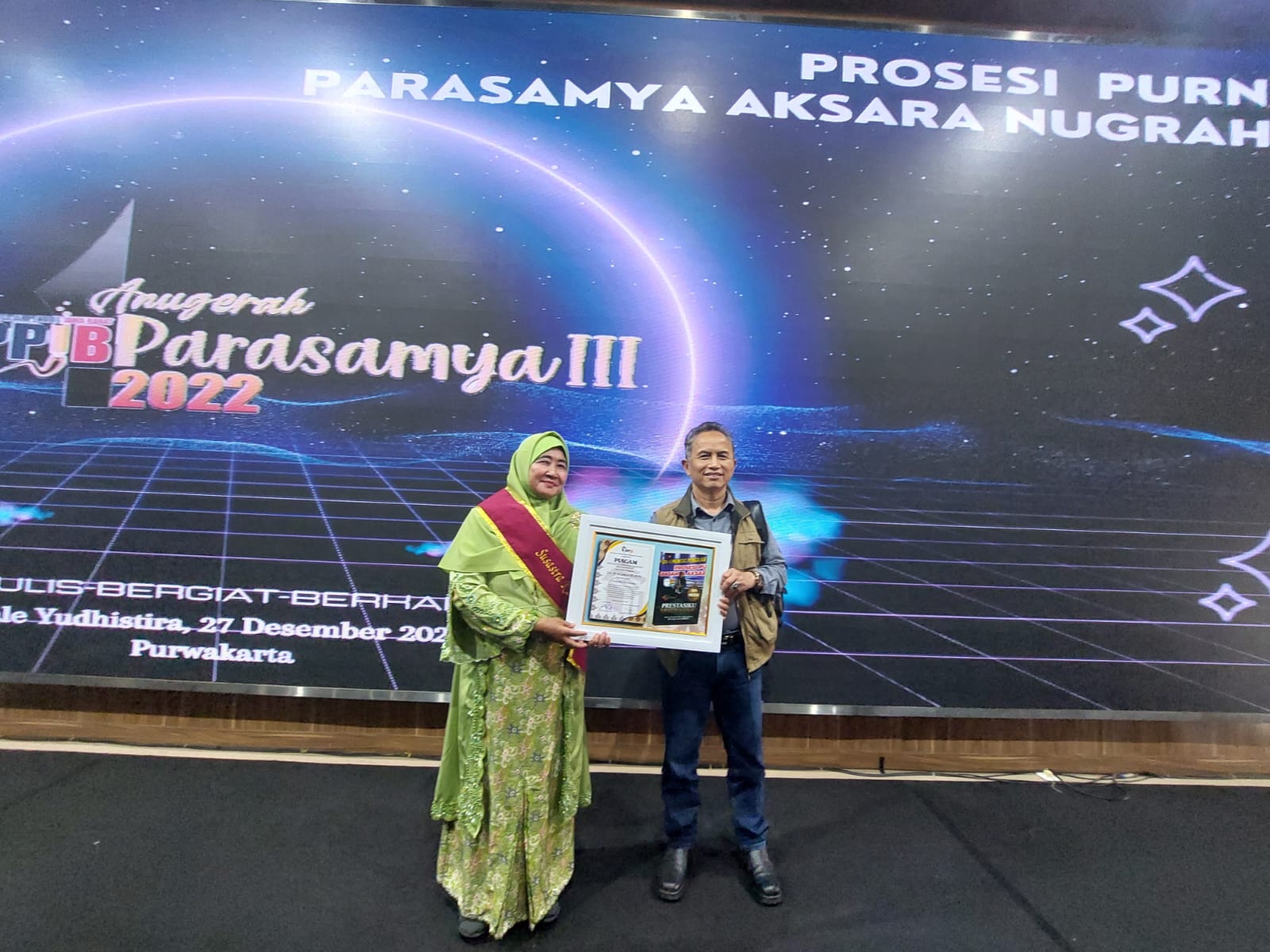 ESQNews.id, Purwakarta - Dra. Hj. Iis Suharti atau yang akrab dengan nama Pena Bunda Ziiban itu mendapat penghargaan Piagam Parasamya Susastra Nugraha (Penulis terbaik dengan judul buku "Prestasiku Motivasimu"). Ajang tersebut digelar sangat meriah pada tanggal 27 Desember 2022 bertempat di Purwakarta, Jawa Barat.