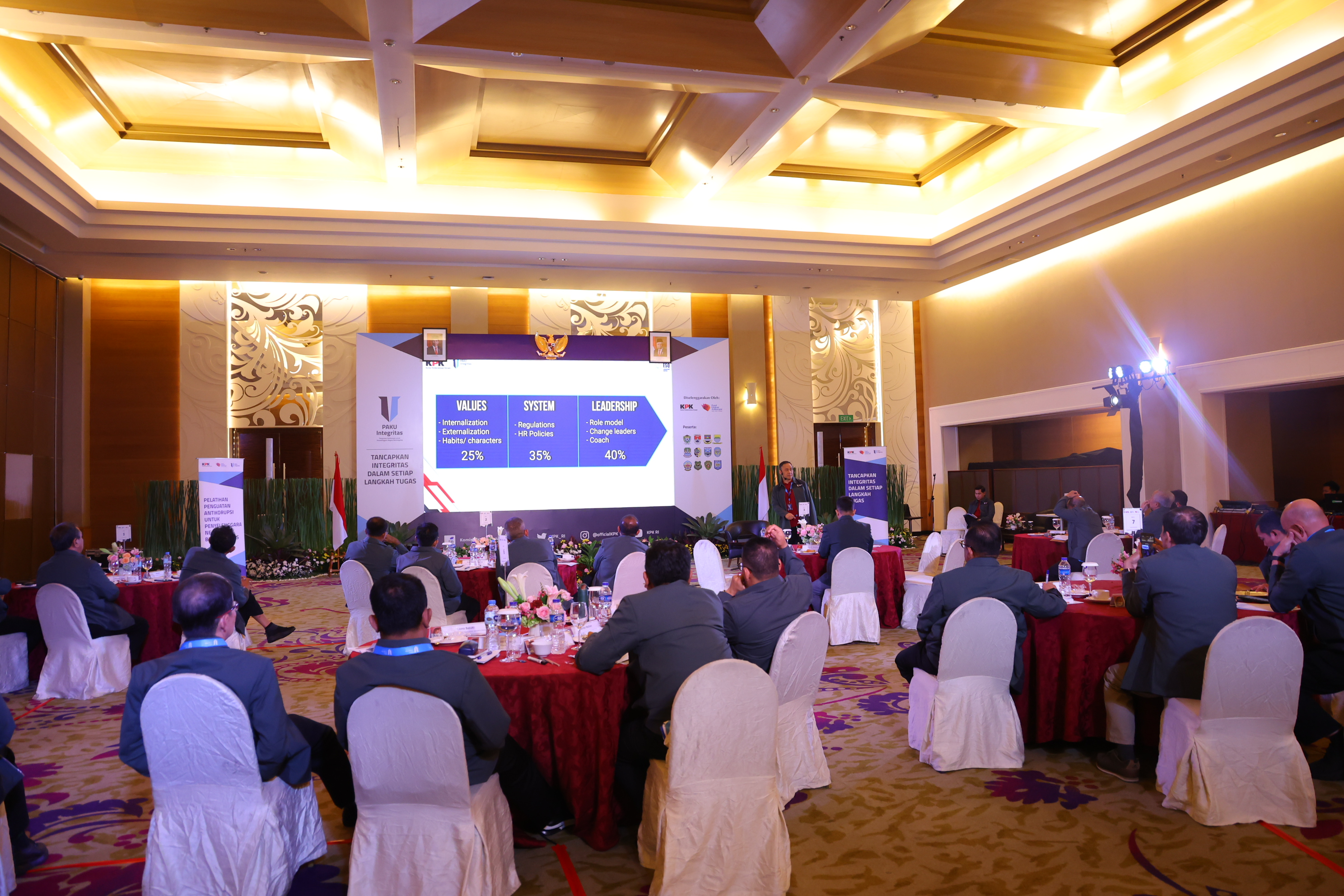 "Bagaimana cara menciptakan Indonesia yang terbebas korupsi? Kita harus paham dulu bahwa ada 3 lapisan perubahan perilaku yakni hasil, cara dan identitas," ujar Ary saat mengisi materi yang bertajuk Membangun Karakter Penyelenggara Negara yang Berintegritas dan Debrief serta Refleksi Integritas.