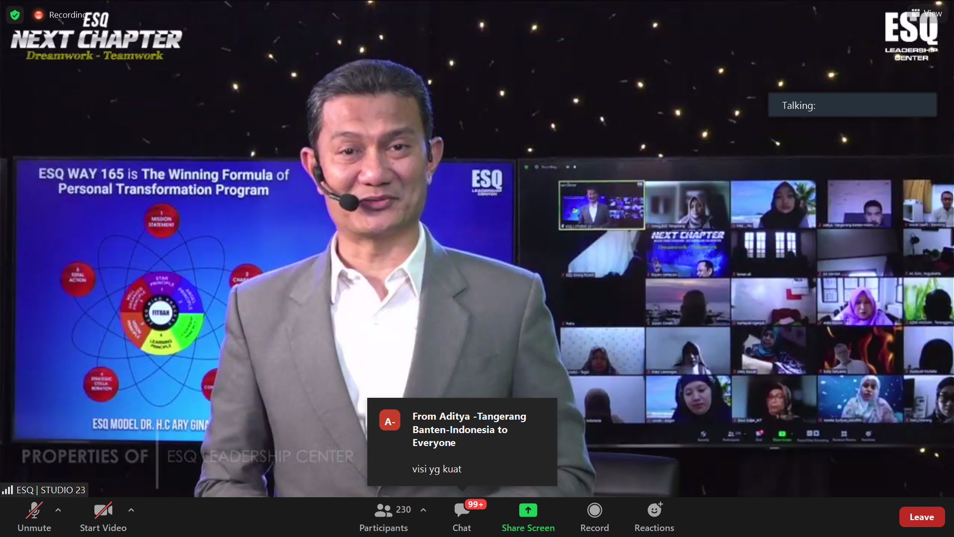 Suasana webinar jadi penuh haru, ditambah lagi multimedia dari ESQ yang berteknologi modern. Seperti penataan lampu, layar (green screen), sounds system dipersembahkan khusus untuk peserta training. Tujuannya agar mereka selalu menikmati setiap sesinya, meskipun berjalan dari pagi hingga sore.