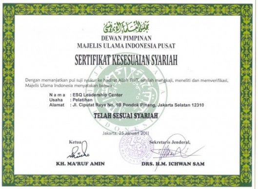 Sekjen MUI, Ichwan Sam, mengatakan sertifikasi dikeluarkan setelah melakukan kajian seksama selama kurang lebih 6 bulan. Kajian intensif ditempuh baik melalui observasi dan mengikuti pelatihan secara langsung, wawancara, dan meniliti buku-buku yang menjadi referensi utama ESQ. Disimpulkan, bahwa ESQ bukan lembaga yang menyebarkan paham keagamaan yang sesat dan menyesatkan. “Buktinya tidak ada alumni ESQ murtad atau alamai degradasi pada akidah dan aktivitas keagaamaan,” ungkap dia.