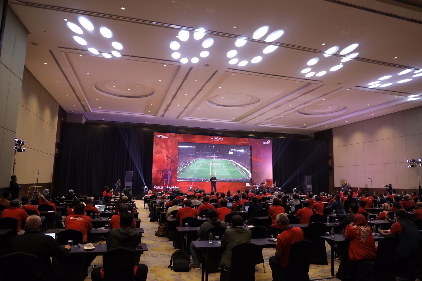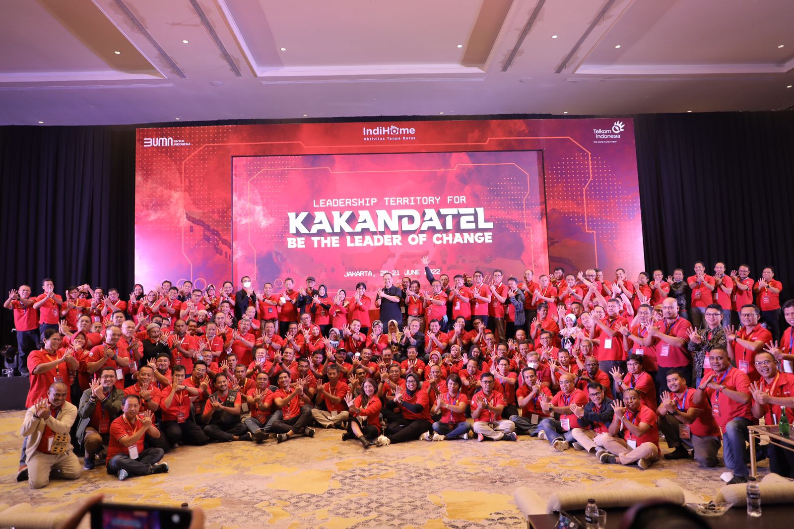 Ratusan pimpinan IndiHome katakan “Bisaaaaa” sambil kepalkan tangannya ke atas dengan penuh antusiasme dan nada tinggi tanda semangat.