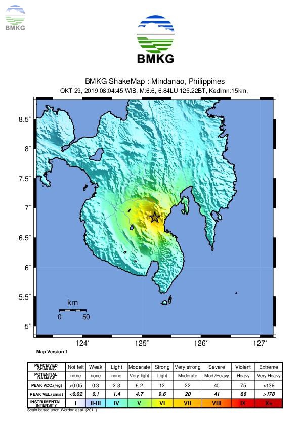 Hasil analisis BMKG menunjukkan gempa ini memiliki magnitudo M=6,5 dengan episenter terletak di darat pada pada koordinat 6,95 Lintang Utara dan 125,21 Bujur Timur tepatnya di darat pada jarak 46 kilometer arah barat daya Kota Davao, pada kedalaman 10 km.