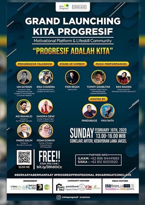 ESQNews.id, JAKARTA - Komunitas Kita Progresif menggelar acara yang mengangkat tema "Progresif adalah kita" sekaligus grand launching Kita Progresif, Motivational platform & lifeskill community pada Minggu (16/2/2020) di Conclave Arteri, Jakarta Selatan.