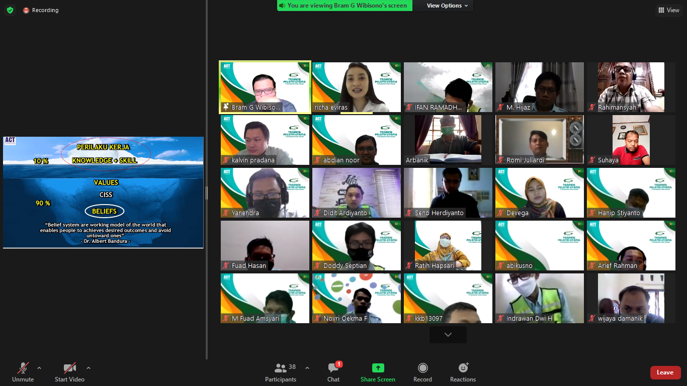 “Wah luar biasaaa. Jadi manusia itu ibarat gunung es. Yang terlihat oleh sekitar kita adalah perilaku saat kerja. Tapi sebenarnya di balik itu ada values dan belief system,” ucap Bram sambil mengapresiasi pesertanya.
