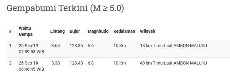 ESQNews.id, AMBON - Gempa dengan kekuatan M 6,8 terjadi di wilayah Ambon, Maluku pada Kamis (26/9/2019) pagi pukul 06.46 WIB kemudian disusul gempa kedua dengan kekuatan M 5,6 yang terjadi pukul 07.39 WIB.