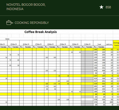 Salah satu cara Novotel Bogor dalam mengurangi limbah untuk Ibu Pertiwi kita yang indah yaitu dengan telah menganalisis tren konsumsi tamu rapat di hotel, oleh karena itu memilah jumlah makanan yang paling populer dan makanan yang kurang populer di coffee break dan melakukan penyesuaian kuantitas yang diperlukan untuk menghindari atau meminimalkan pemborosan. Contoh: Peserta rapat adalah 300 orang, berdasarkan tren konsumsi tamu pertemuan di Novotel Bogor pada bulan sebelumnya, silakan temukan di file terlampir, 4 item yang disorot yang akan diukur pada formula excel, kemudian akhirnya muncul pada jumlah makanan yang disesuaikan.