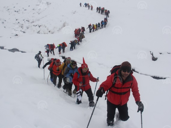 Para pendaki gunung mendaki puncak Pegunungan Allahuekber dalam acara "Pawai Turki bersama Para Martir" untuk memperingati para pahlawan Perang Dunia I dalam Pertempuran Sarikamis, di Igdir, Turki pada Kamis (05/01/2020). The Pawai menandai peringatan 105 tahun pertempuran yang merenggut nyawa hampir 90.000 tentara Turki Utsmani karena cuaca dingin yang ekstrem.