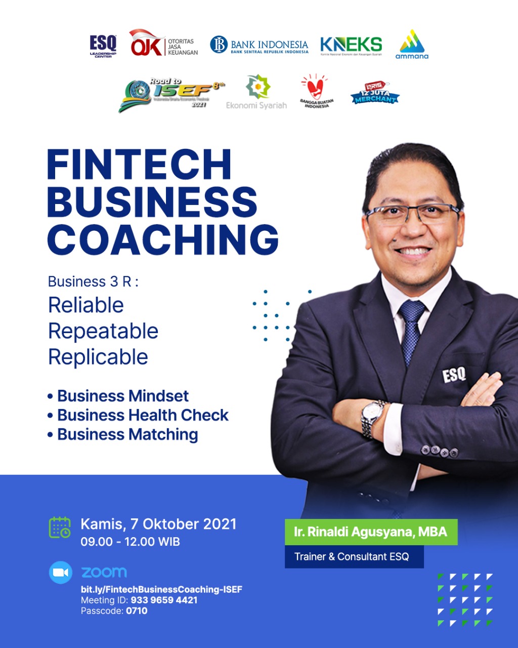 Saat sesi webinar dan coaching, para peserta akan dipandu langsung oleh Rinaldi Agusyana, trainer dan konsultan ESQ. Ia membawakan webinar dengan tema FINTECH BUSINESSS COACHING. Di dalamnya akan membahas tentang Business 3 R (Reliable, Repeatable, Replicable) serta Business Mindset, Business Health Check, dan Business Matching.