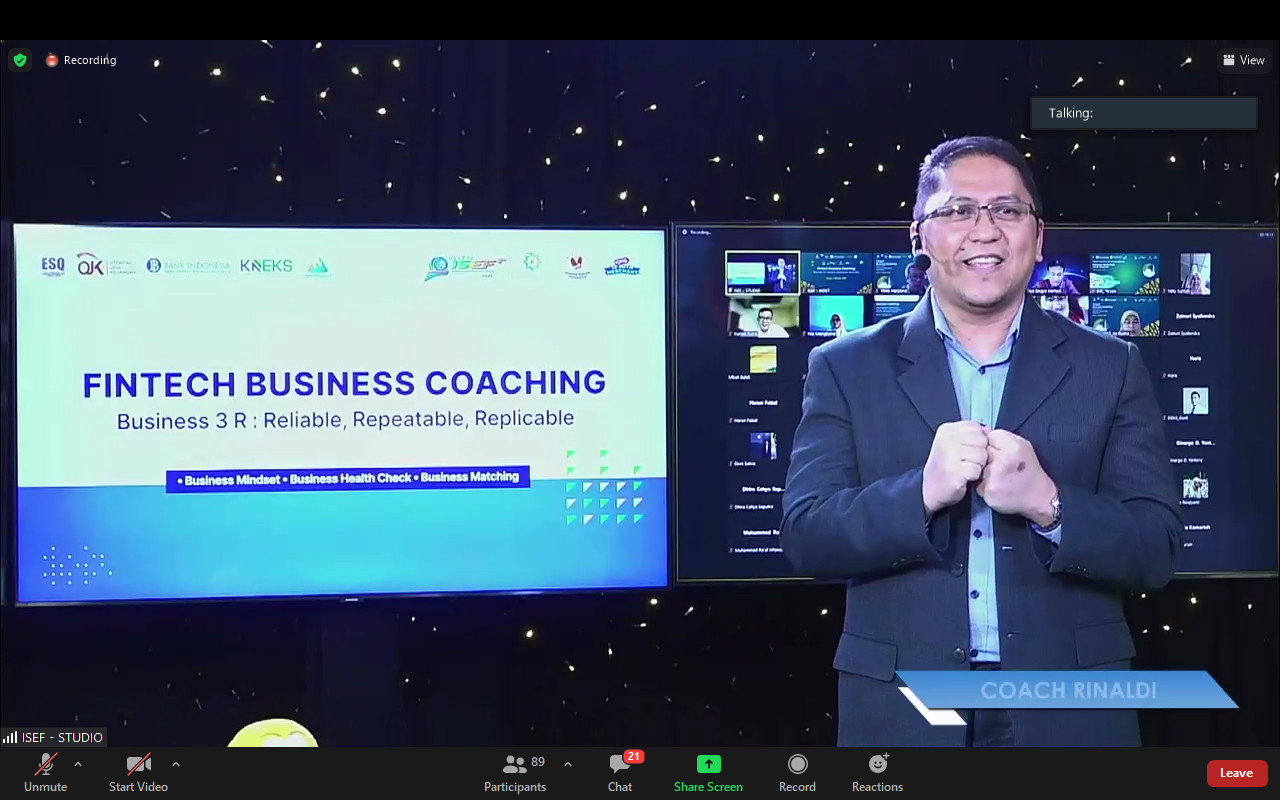 Saat sesi webinar dan coaching, para peserta dipandu langsung oleh Rinaldi Agusyana, trainer dan konsultan ESQ, ditemani oleh Akbar (Asisten trainer). Rinaldi membawakan webinar dengan tema FINTECH BUSINESSS COACHING.  Di dalamnya membahas tentang Business 3 R (Reliable, Repeatable, Replicable) serta Business Mindset, Business Health Check, dan Business Matching.