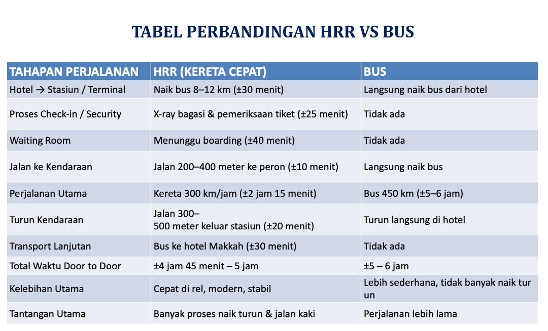 Banyak calon jemaah kemudian beranggapan bahwa perjalanan menggunakan kereta cepat pasti lebih nyaman, lebih cepat, dan lebih efisien dibandingkan menggunakan bus.