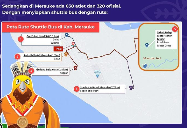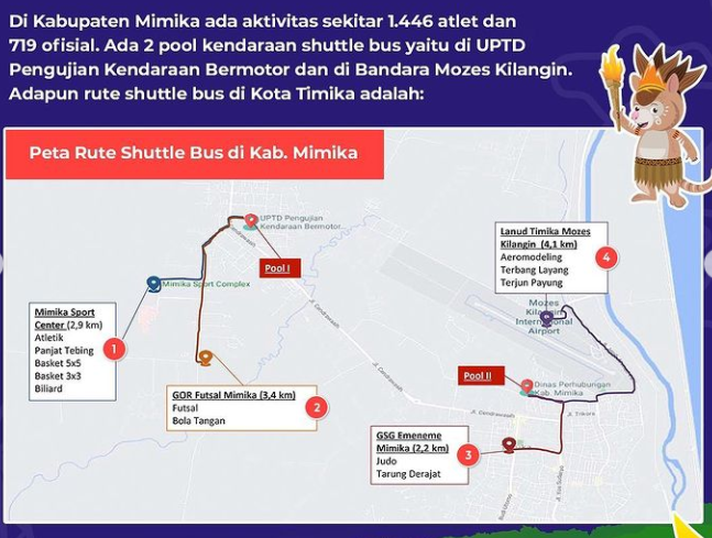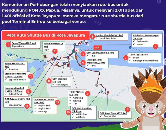 Sebanyak 428 bus disiapkan untuk melayani 9.703 atlet dan 9.663 ofisial di empat klaster pertandingan PON XX Papua. Dari keempat klaster tersebut, Kota Jayapura mendapat bus sebanyak 175 bus, Kabupaten Jayapura 123 bus, Kabupaten Mimika 92 bus, dan Kabupaten Merauke 38 bus.