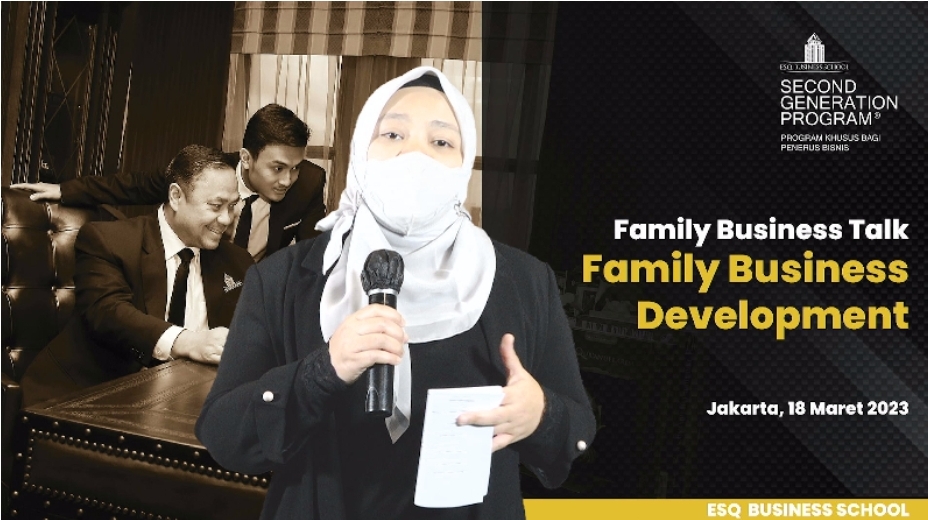 Acara Family Business Talk yang digelar oleh ESQ Business School dengan program second generation pada tanggal 18 Maret 2023 ini dimoderatori langsung oleh Dwitya Agustina, S.T., MBA. (family business researcher President ESQ Business School).