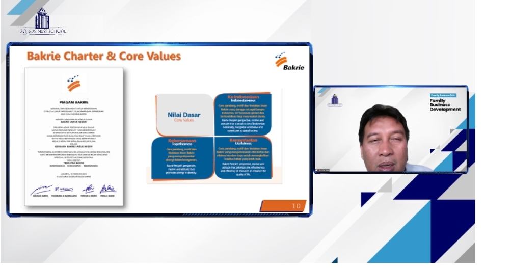 “Setiap bulan, program second generation mengadakan family business talk khusus untuk pelanjut bisnis keluarga. Dan hari ini, kita membahas Family Business Development bersama narasumber dari Bakrie Grup yang dikatakan memiliki 7 nyawa, yang berhasil bertahan melalui 7 rintangan," ungkap Dwitya saat mengawali sesi.