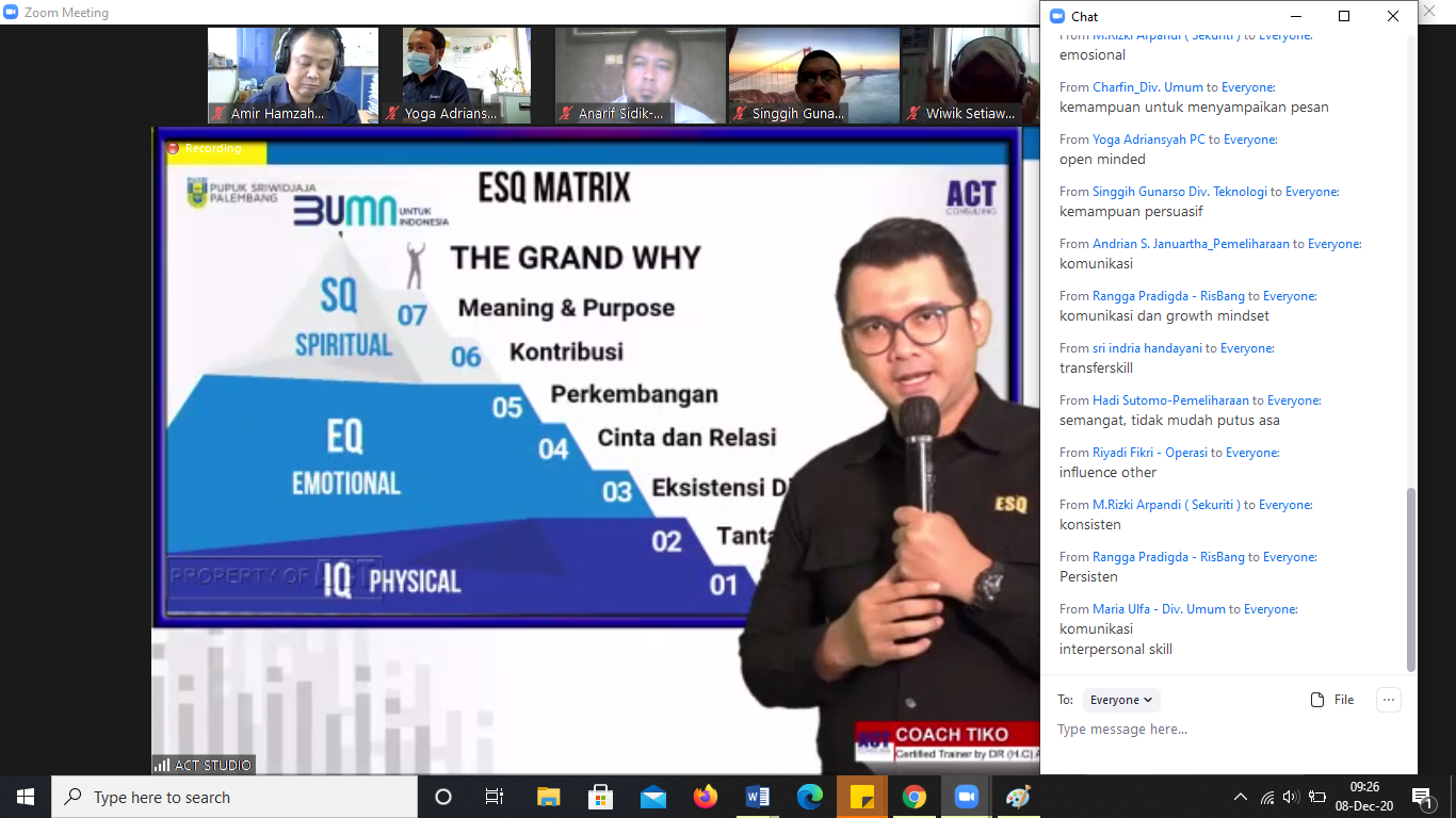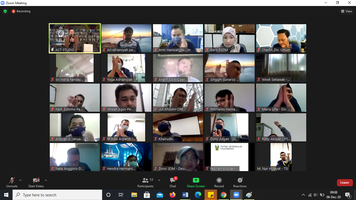 ESQNews.id, JAKARTA – ACT Consulting gelar Program Agent of Change on Boarding "AKHLAK Start With Me" di PT Pupuk Sriwidjaja Palembang (PUSRI) selama 2 hari pada Senin-Selasa (7-8/12/2020) live by Zoom, yang dipandu langsung oleh trainer lisensi dari Dr. (H.C) Ary Ginanjar Agustian yakni Coach Tiko dan Coach Sandi.