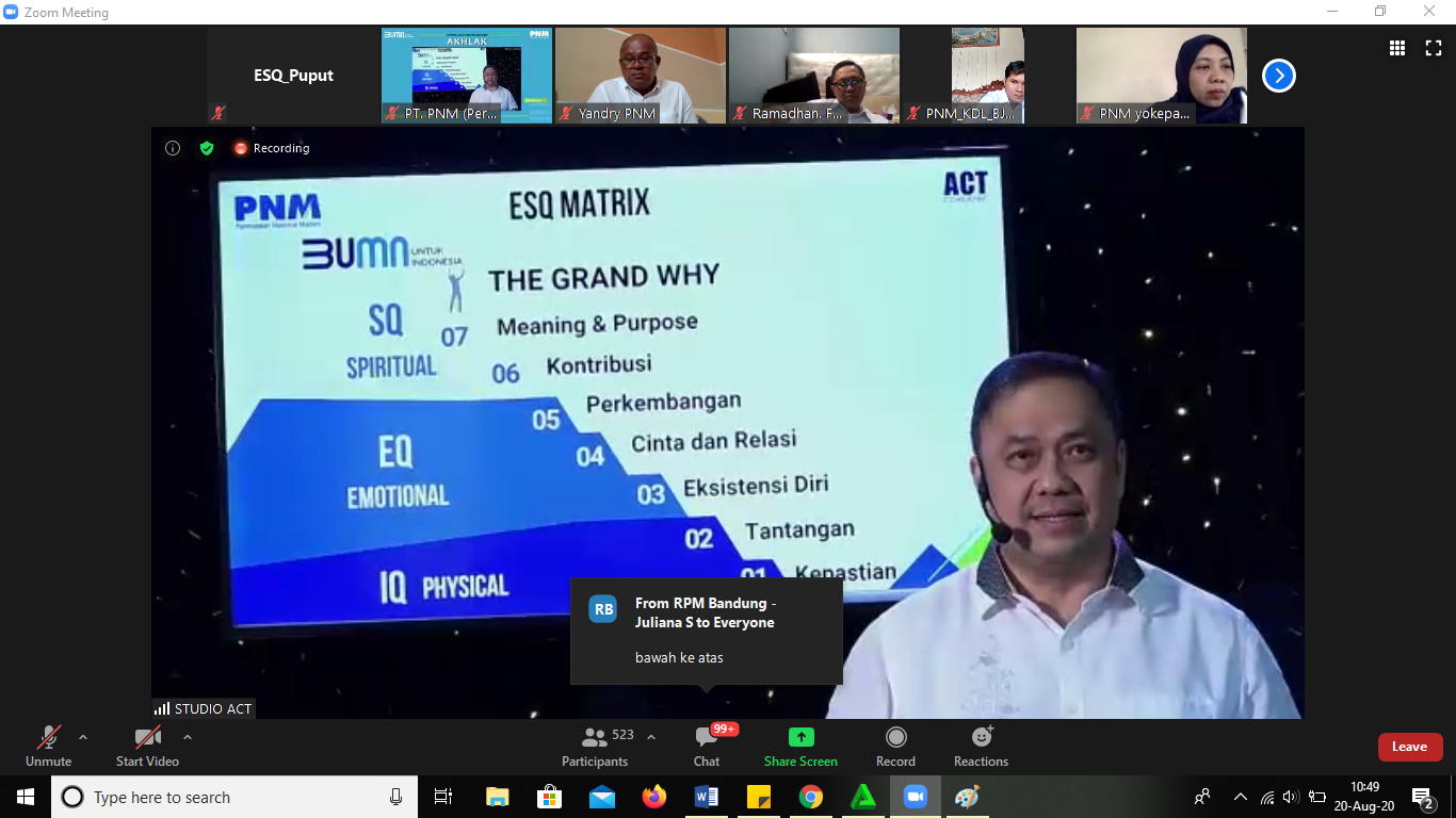 Saat webinar berlangsung pun, Ary Ginanjar Agustian mengundang semua Direktur PT PNM untuk mengikuti program Training Coaching selama 5 hari dengan gratis. Demi menghandle milennials, yang akan membangkitkan PNM menuju Indonesia Emas 2045.