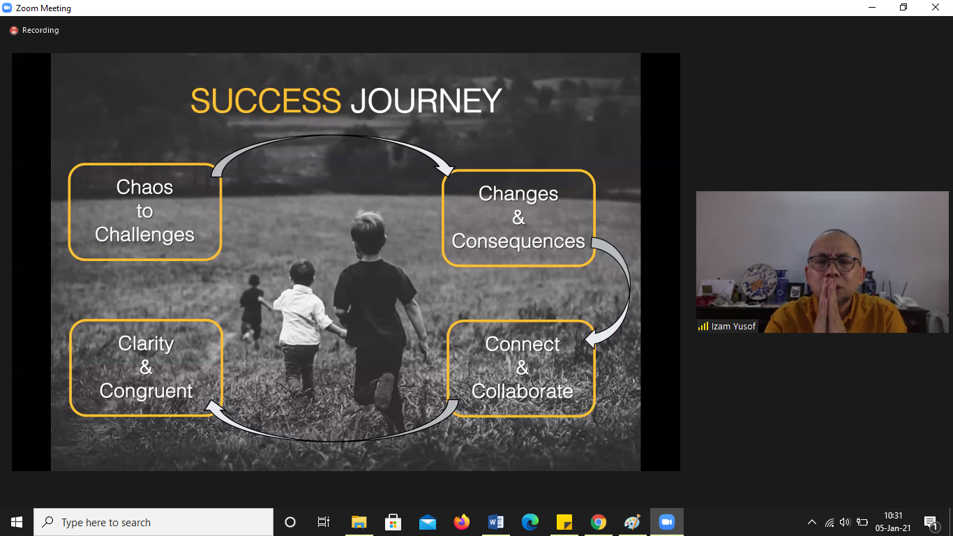 Ia membagikan beberapa slide di antaranya tentang success journey yang terdiri dari Chaos to Challenges (kekacauan sebagai tantangan), Changes and Consequences (perubahan dan konsekuensi), Connect and Collaborate (terhubung dan kerjasama), Clarity and Congruent (jelas dan sesuai).