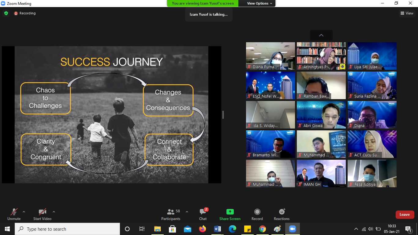 ESQNews.id, JAKARTA - ACT Consulting menyelenggarakan seminar virtual dengan tema "Learning Session: How to Sustain Engagement in Organisation Transformation Journey". Webinar ditayangkan secara langsung melalui Zoom Platform pada Selasa, (05/01/2021).