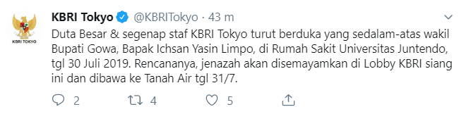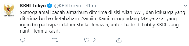 Menurut informasi @KBRITokyo, beliau meninggal pada pukul 07.35 waktu setempat di Jepang pada (30/7).