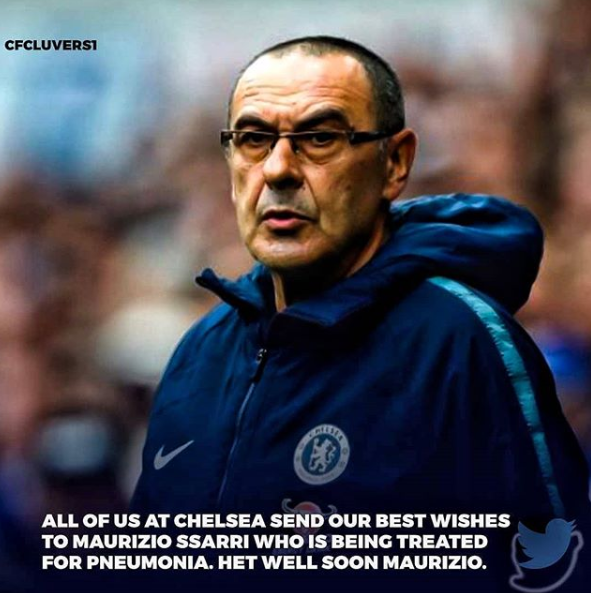 Dalam postingannya tertera tulisan “Chelsea have wished their formerl manager Maurizio Sarri a speedy recovery as he has been diagnosed with pneumonia, his current team, Juventus confirms. We all wish you well Maurizio”