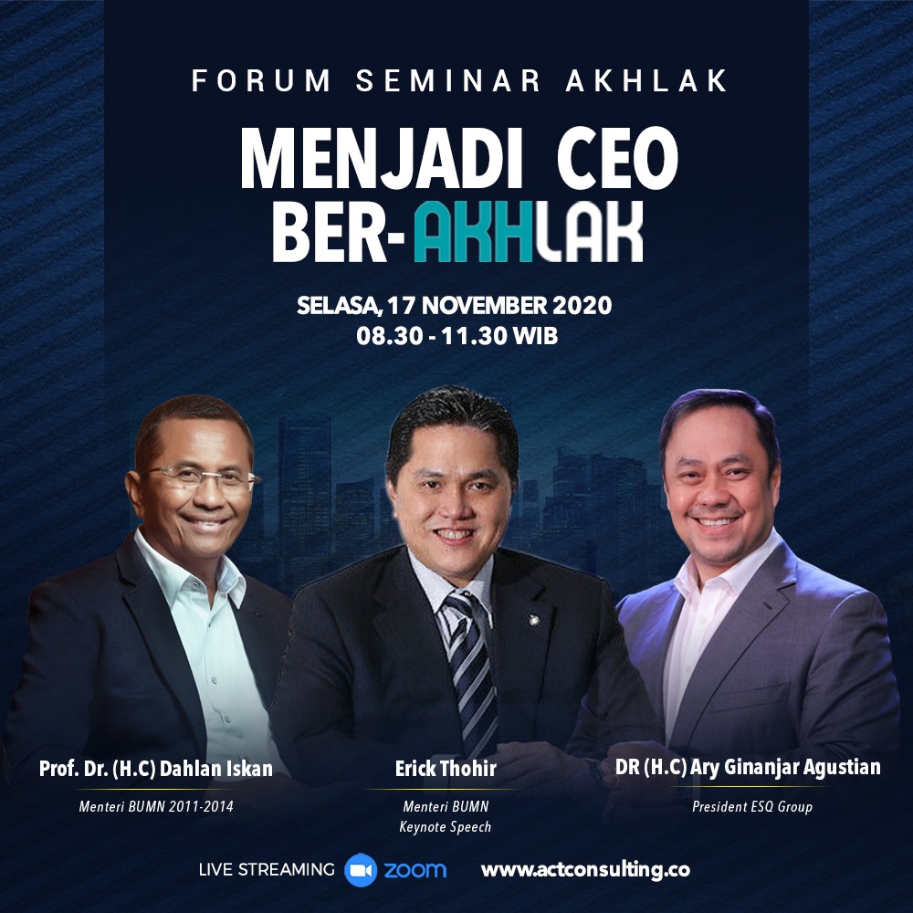 ESQNews.id, JAKARTA – ACT Consulting akan menyelenggarakan sebuah Webinar bertajuk "Menjadi CEO Ber-AKHLAK" pada Selasa (17/11/2020) pukul 08.30 - 11.30 WIB by Zoom Meeting. Tujuannya adalah agar seorang CEO dapat sukses menjadi role model sekaligus membawa timnya menuju impian yang di cita-citakan.