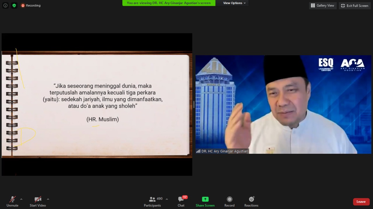 Ary Ginanjar menjelaskan 1 buah slide dari HR. Muslim untuk mengingatkan kita semua yaitu “Jika seseorang meninggal dunia, maka terputuslah amalannya kecuali tiga perkara (yaitu): sedekah jariyah, ilmu yang dimanfaatkan, dan doa anak yang sholeh.”