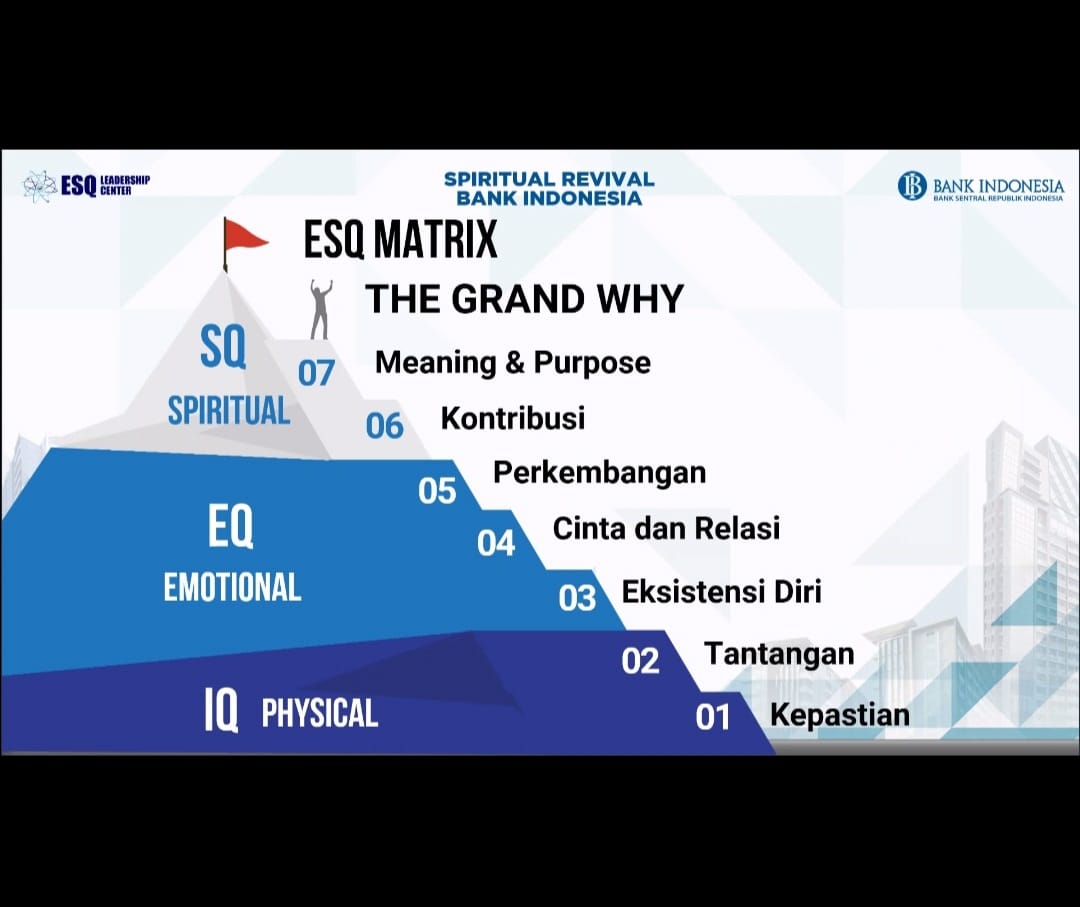 “Pak Perry itu adalah alumni ESQ juga. Beliau menjadi Alumni ESQ di Washington pada tahun 2009. Dan Alhamdulillah di tahun 2018 beliau sudah menjadi Gubernur Bank Indonesia. Nah di sini kita jabarkan terkait cara berfikir dan mindsetnya beliau, melihat leadershipnya. Kalau dari gambar ini, kira kira beliau berangkat dari atas ke bawah atau dari bawah ke atas?” tanyanya sambil membagikan sebuah gambar yang diberi judul ESQ Matrix.