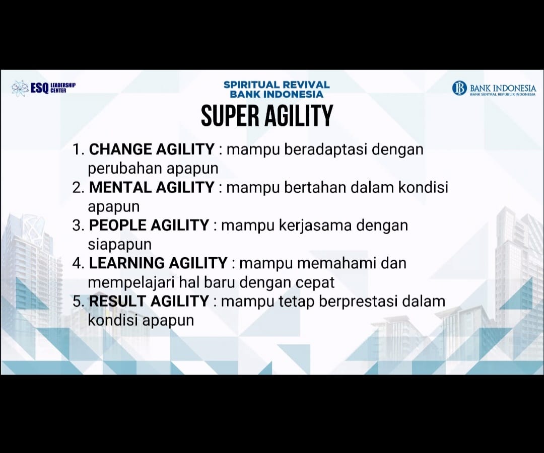 “Selain ESQ Matrix, untuk menghadapi era VUCA ini kita harus membuat bangunan SDM BI di masa depan. Ada atap, tiang dan fondasi. Atapnya itu kompetensi, dan tak cukup jika hanya itu. Harus diperkuat dengan 5 tiang atau super Agility yaitu change agility, mental agility, people agility, learning agility, result agility,” papar sang pendiri ACT Consulting itu.