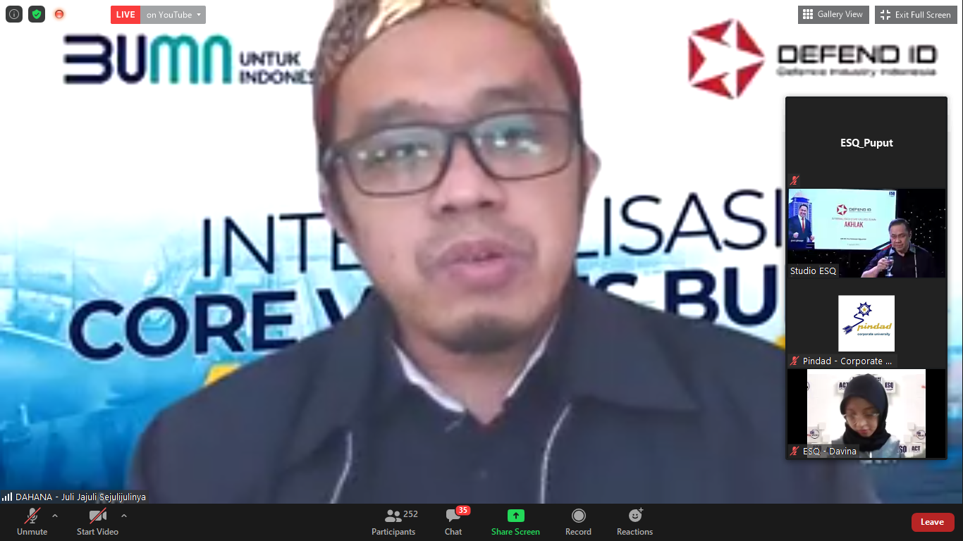 ESQNews.id, JAKARTA – Senin (3/8/2020), diadakan event Internalisasi Core Values BUMN AKHLAK. Di lingkungan BUMN Cluster Industri Pertahanan (INHAN). Via Zoom Meeting dan Channel Youtube Pindad Corporate University.