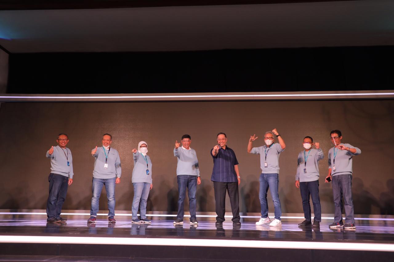 Para petinggi Pegadaian nampak kompak memakai sweater biru muda dengan sangat serasi.