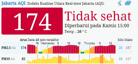 Jakarta merupakan salah satu kota yang memiliki polusi udara  tidak sehat dapat dilihat di http://aqicn.org/city/indonesia/kemayoran/ atau gambar dibawah: