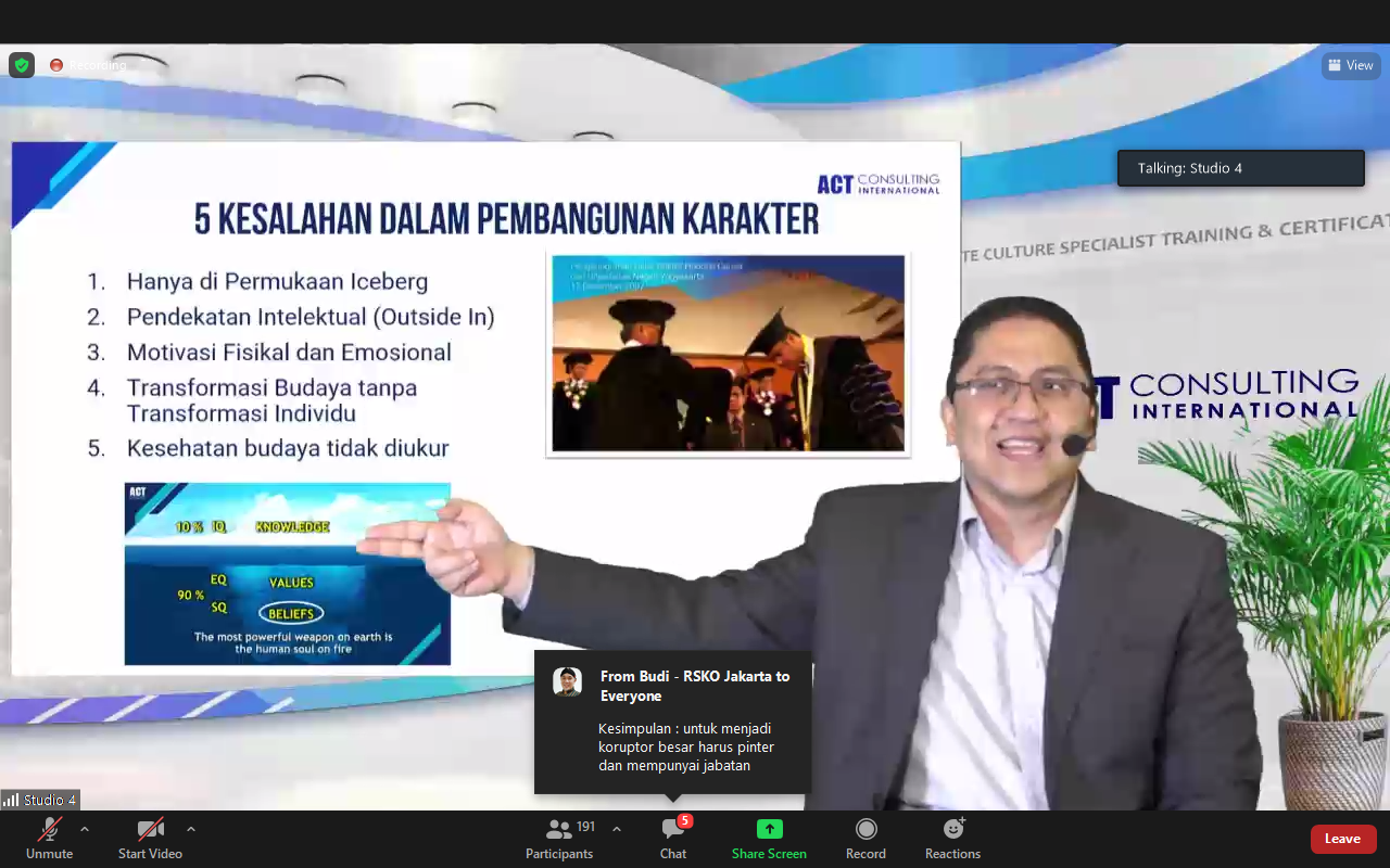ESQNews.id, JAKARTA - ACT Consulting menggelar Training dan Sertifikasi Strategi Efektif Pembangunan Budaya Rumah Sakit atau yang dikenal dengan Corporate Culture Specialist (CCS) pada Rabu-Jumat (6-8/4/2022). Pelatihan ini diikuti oleh kurang lebih 200 Rumah Sakit Se-Indonesia, yang dilaksanakan secara online melalui Zoom Meeting. ACT Consulting memberikan training ini secara gratis kepada masing-masing RS (perwakilannya saja).