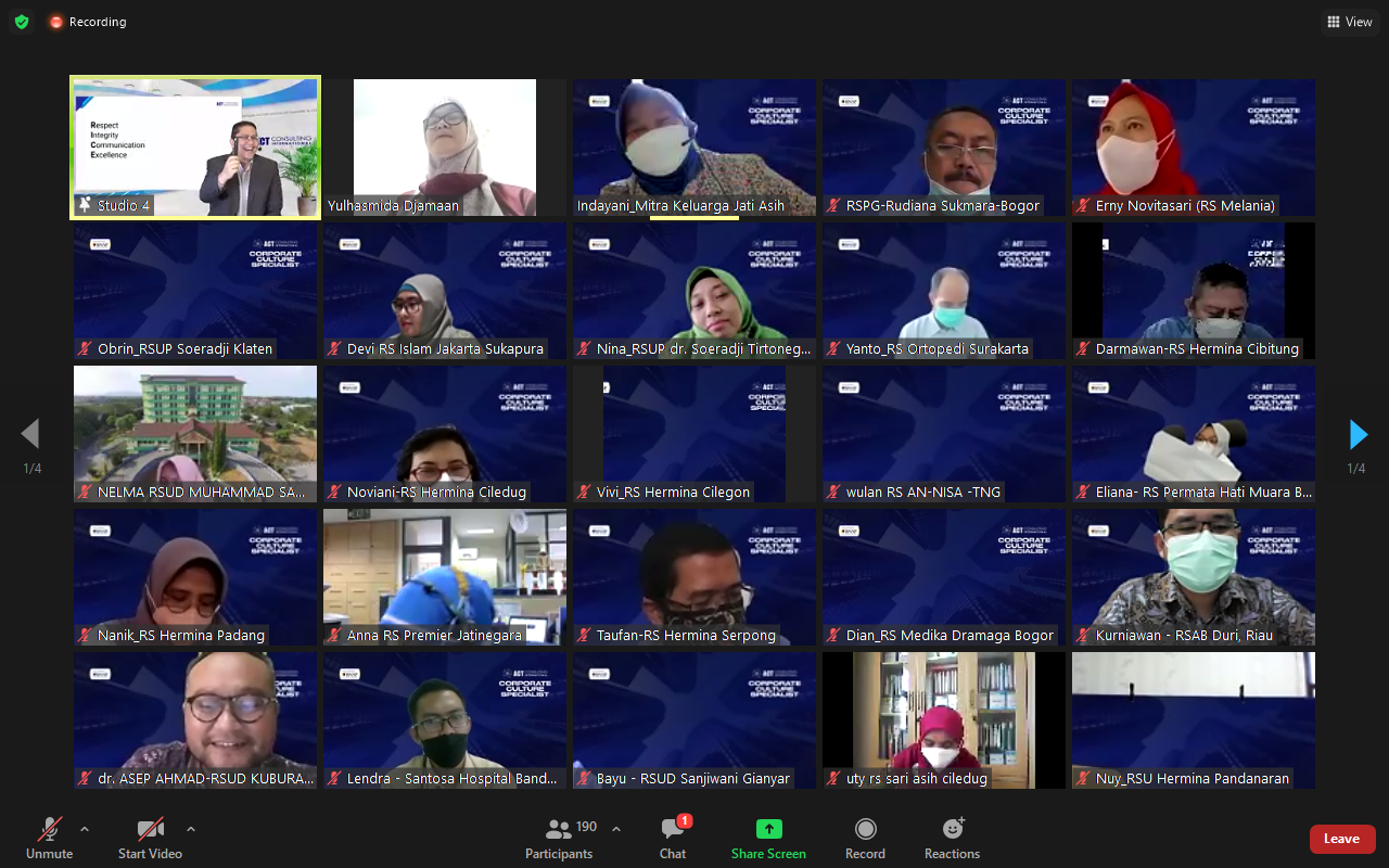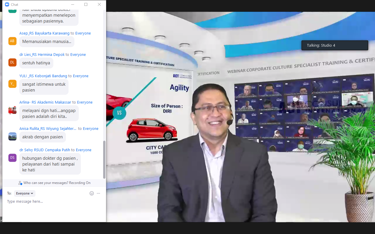 Ratusan RS yang bergabung dalam webinar tersebut ikutserta juga dalam training CCS yang dipandu langsung oleh Rinaldi Agusyana (Trainer lisensi Ary Ginanjar Agustian) dari Studio lantai 4 Menara 165. Peserta yang hadir yaitu para direktur beserta jajarannya, yang mempunyai posisi penting atau berpengaruh di lingkup RS masing-masing.