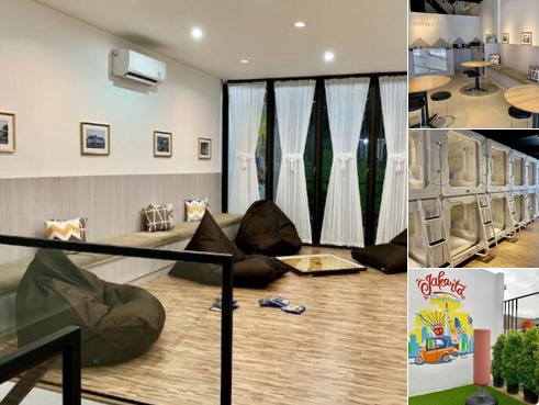 Hostel terasik karena mempunyai billiard, dan rooftop. Jadi bisa santuy sambil menikmati Jakarta. Ada taman dengan cottage yang memakai pelepah daun kering.