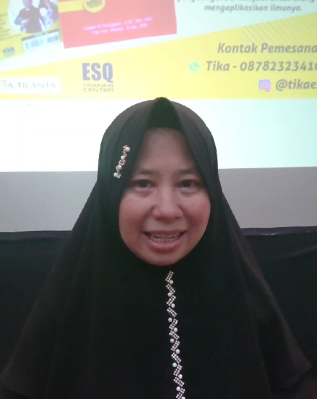 "Kesannya begitu luar biasa, jadi menyadarkan bahwa saya ini banyak kekurangan, baik dalam ibadah maupun kehidupan sehari-hari. Hidup ini pengen ada kemajuan, pengen ada peningkatan, terutama dalam ibadah, pengen yang lebih baik lagi. Terus dari kehidupan sehari-hari yang tadinya kurang baik ke pasangan, orang tua, ke anak, jadi pengen berubah, pengen yang lebih baik lagi. Terus sekarang sih kalau keceplosan ngomongin orang lain atau suudzon langsung merasa berdosa sekali. Banyak hal-hal yang buruk kalau di lakuin jadi langsung sadar. Semoga ke depannya bisa istiqomah dalam menjalankan ibadahnya dan perbuatan baiknya Aamiin. Pokoknya masih banyak kesan baiknya yang di dapat di ESQ ini, sangat luar biasa sekali bisa membersihkan diri, membersihkan hati."