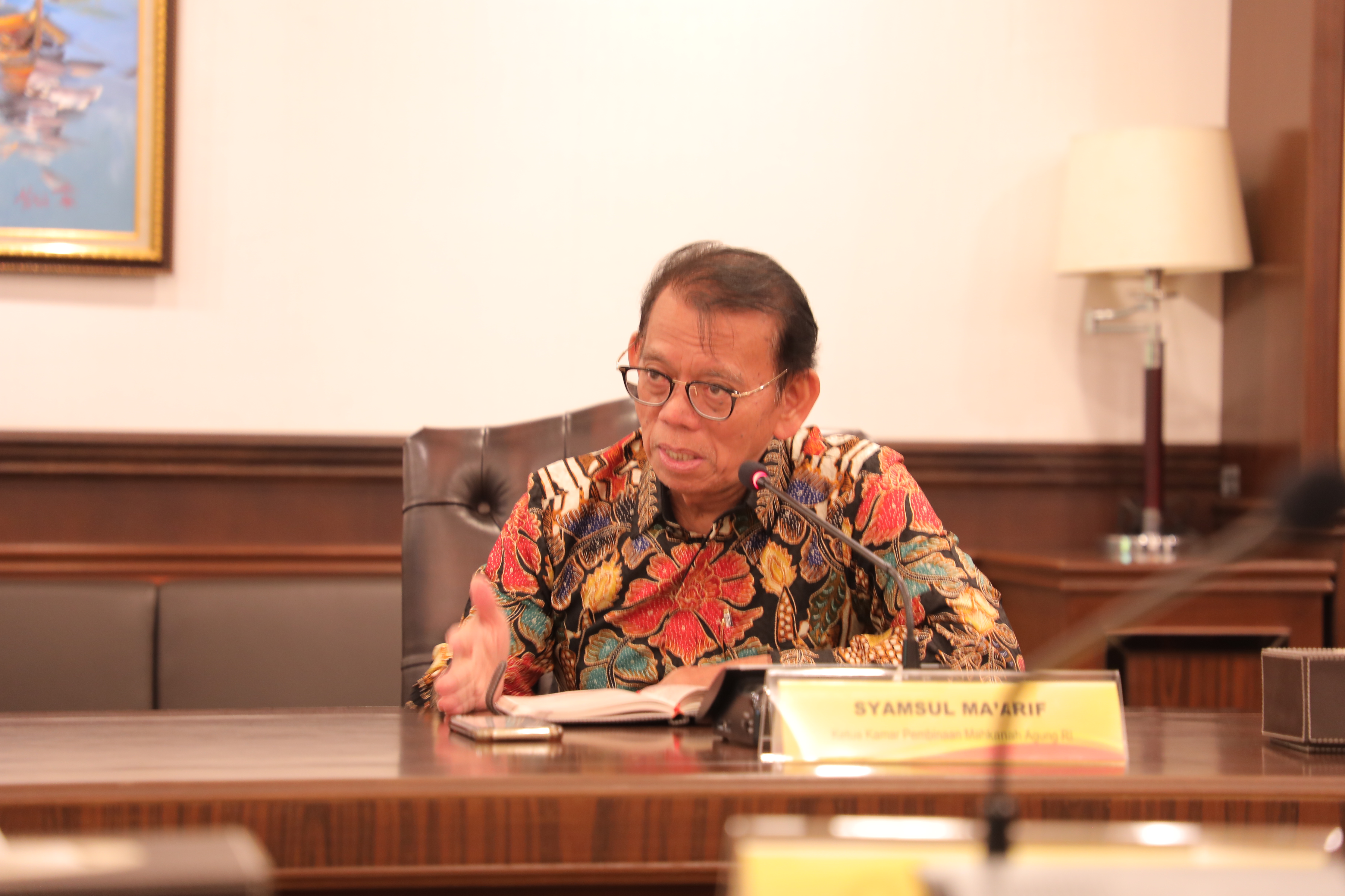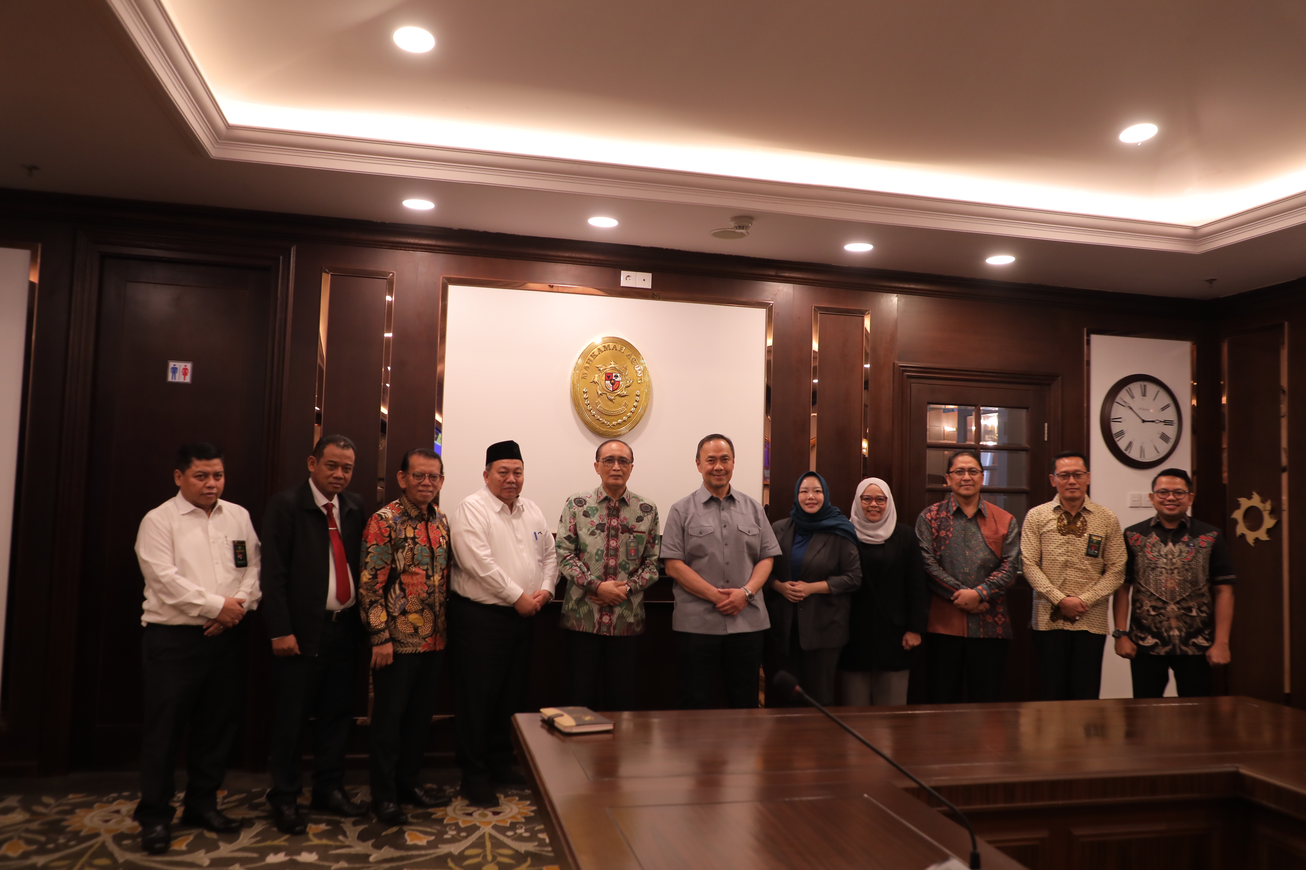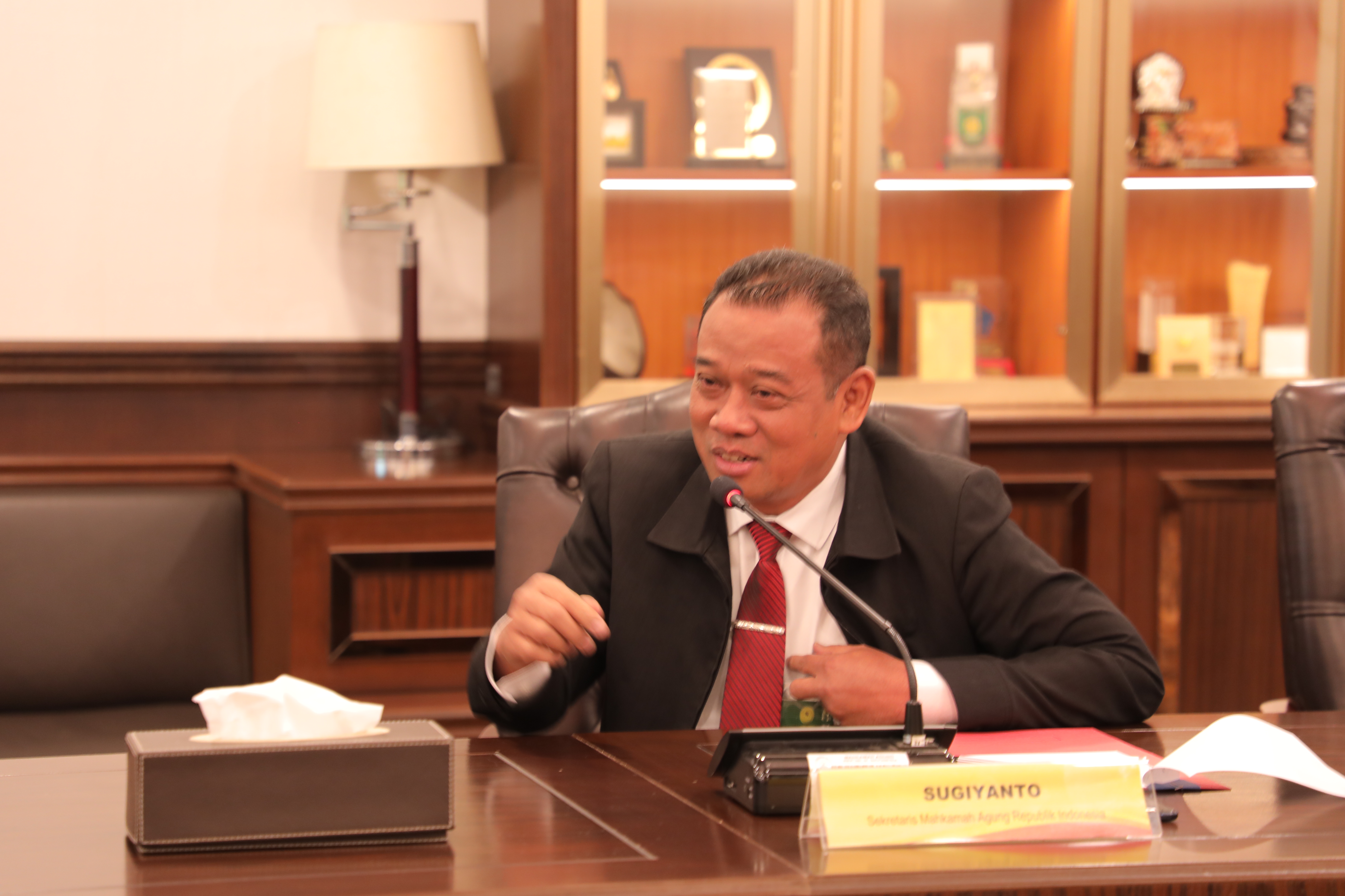 Berkesempatan hadir dalam ruangan di antaranya Sugiyanto, S.H., M.H. (Sekretaris Mahkamah Agung RI), Syamsul Maarif, S.H., L.L.M, Ph.D (Ketua Kamar Pembinaan), Darmoko Yuti Witanto, S.H. (Kapusdiklat Manajemen Kepemimpinan), Taufikurrahman, S.Ak. (Kepala Sub Bidang Program dan Kerjasama).