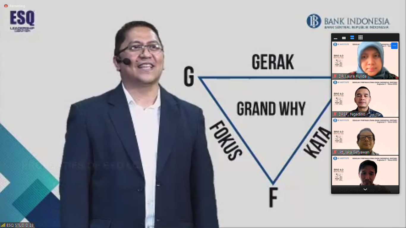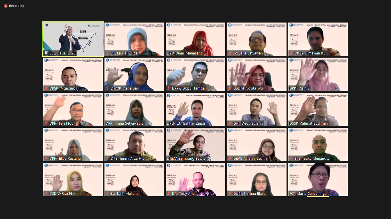 ESQNews.id, JAKARTA – Telah digelar event SPIRITUAL REVIVAL SESTABI 2021 pada Selasa (20/4/2021) via zoom meeting. Sekitar 45 orang yang hadir di dalamnya. Insan Bank Indonesia (BI) dipandu langsung oleh trainer lisensi dari Dr. (H.C) Ary Ginanjar Agustian, Rinaldi Agusyana.