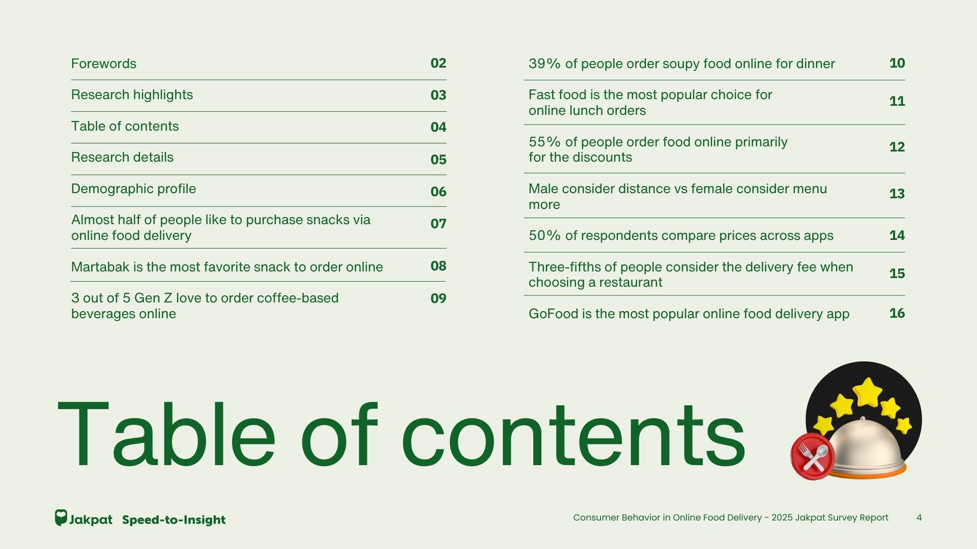 Jakpat melakukan survei untuk mengetahui perilaku konsumen pada aplikasi pesan-antar makanan daring pada awal tahun 2025. Laporan yang melibatkan 1.343 responden ini juga memaparkan kebiasaan responden dalam memesan makanan berat, camilan, dan minuman melalui aplikasi daring.