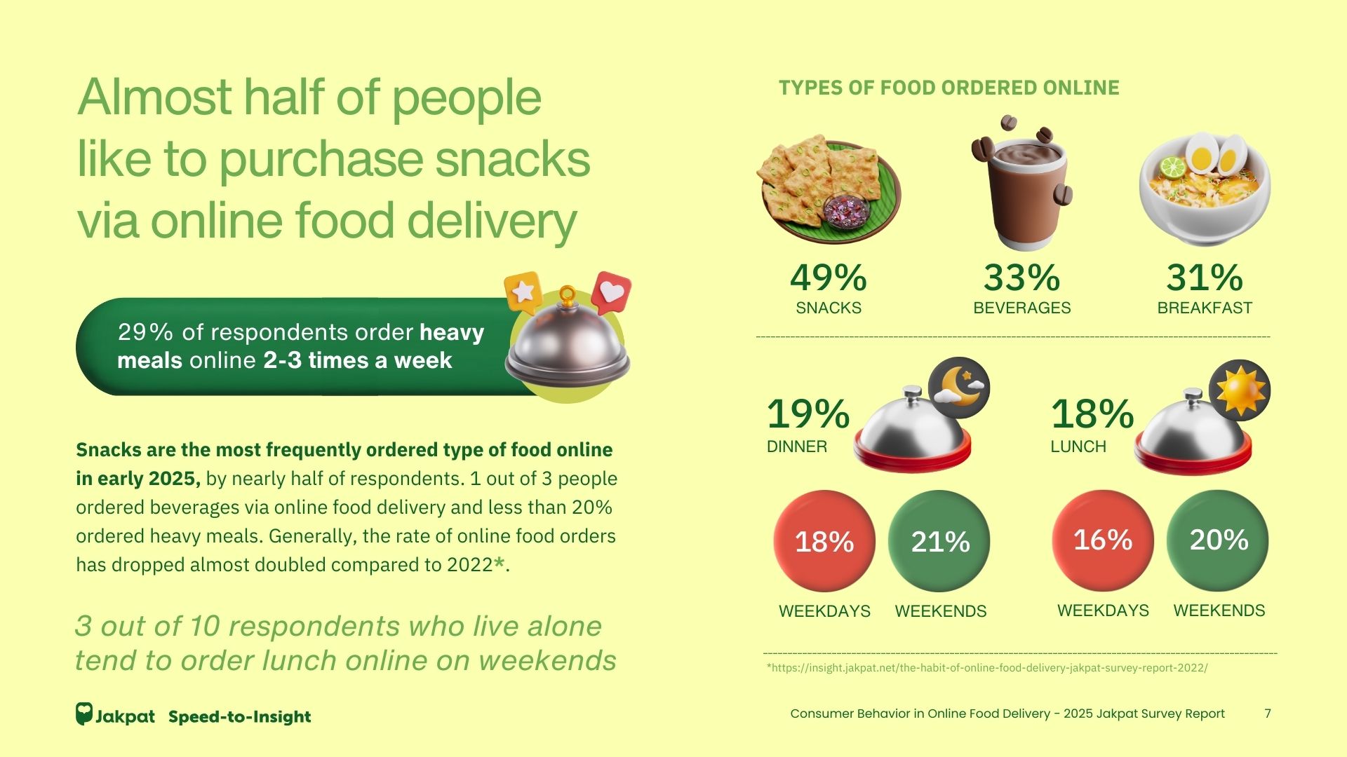 Sebanyak 49% responden mengaku pernah memesan camilan di aplikasi pesan-antar makanan di awal 2025, disusul minuman (33%) dan sarapan (31%). Sementara, 1 dari 5 orang pernah memesan makan berat, baik untuk makan siang maupun makan malam. Secara umum, tingkat pemesanan makanan online turun hampir dua kali lipat dibandingkan tahun 2022.