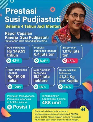 Susi Pudjiastuti, pernah menjabat sebagai Menteri Kelautan dan Perikanan dari Kabinet Kerja 2014-2019. Banyak prestasi yang ia raih saat menjabat seperti gambar berikut: