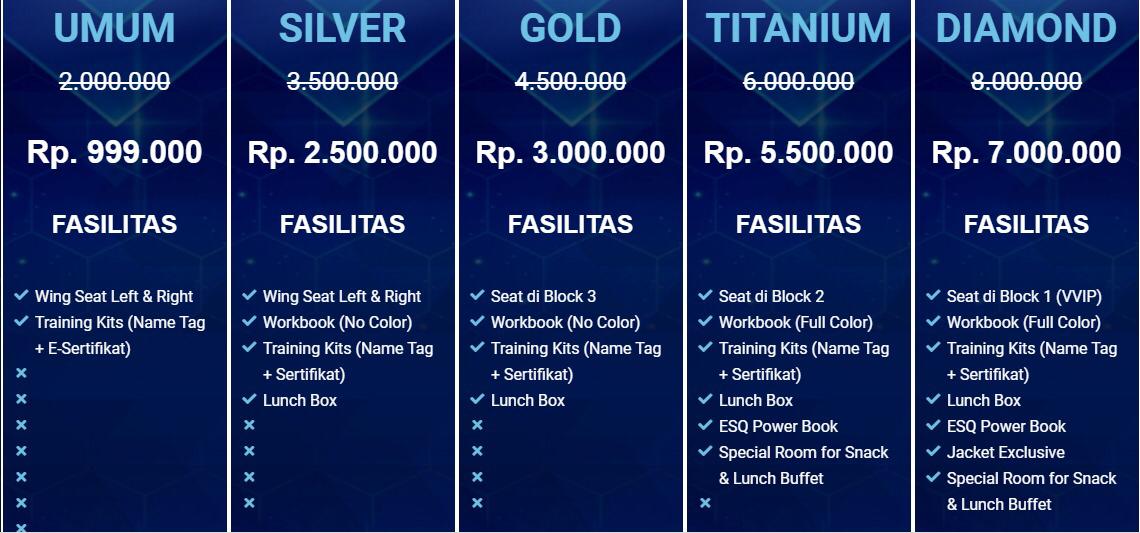 Silakan kunjungi website resmi ESQ berikut untuk mengetahui detail training ini. Ada banyak testimoni, juga termasuk dari para selebriti kondang Tanah Air yang sudah mengikuti TRAINING ESQ EXECUITVE (RECLL).