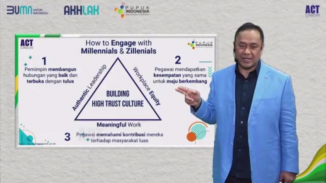 "Maka dari itu ada tiga kunci cara meng-handle milenials dan zelenials. Bukan saya mengajari ilmu ini, namun inilah yang telah saya berikan dan alami sendiri. Hasilnya terbukti bahwa 8 kali lipat agility mereka meningkat dan inovasi mereka 7 kali lipat meningkat. Masa depan Indonesia ditentukan oleh ini," sambungnya.