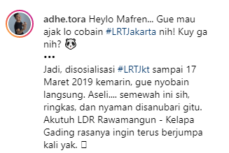 Adapun salah satu selebram sekaligus youtubers yang sudah me-review LRT lewat akun Instagramnya @adhe.tora dengan antusias mengatakan LRT Jakarta super mewah.